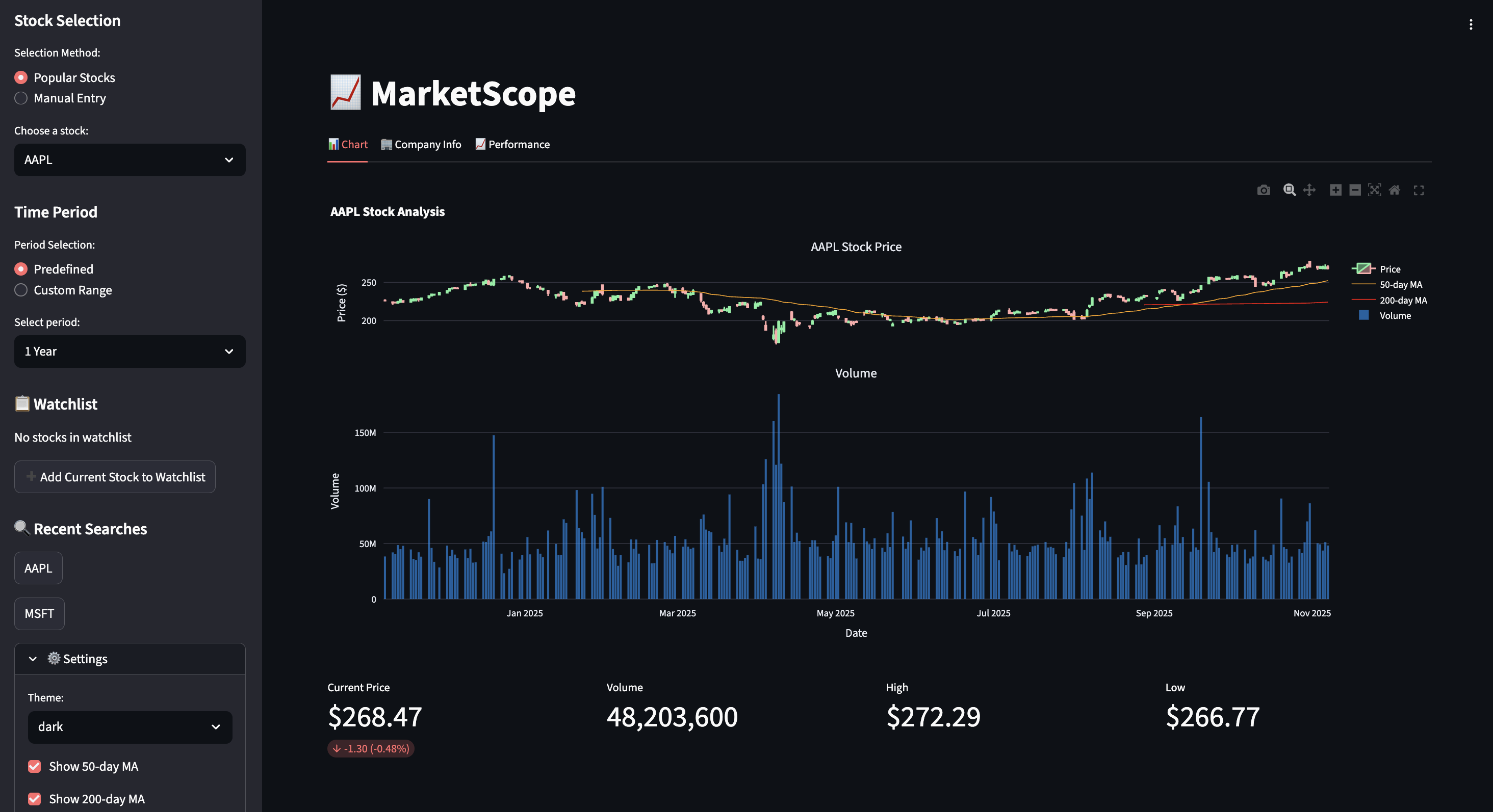 - 📊 Interactive Visualizations: Candlestick + volume charts with Plotly